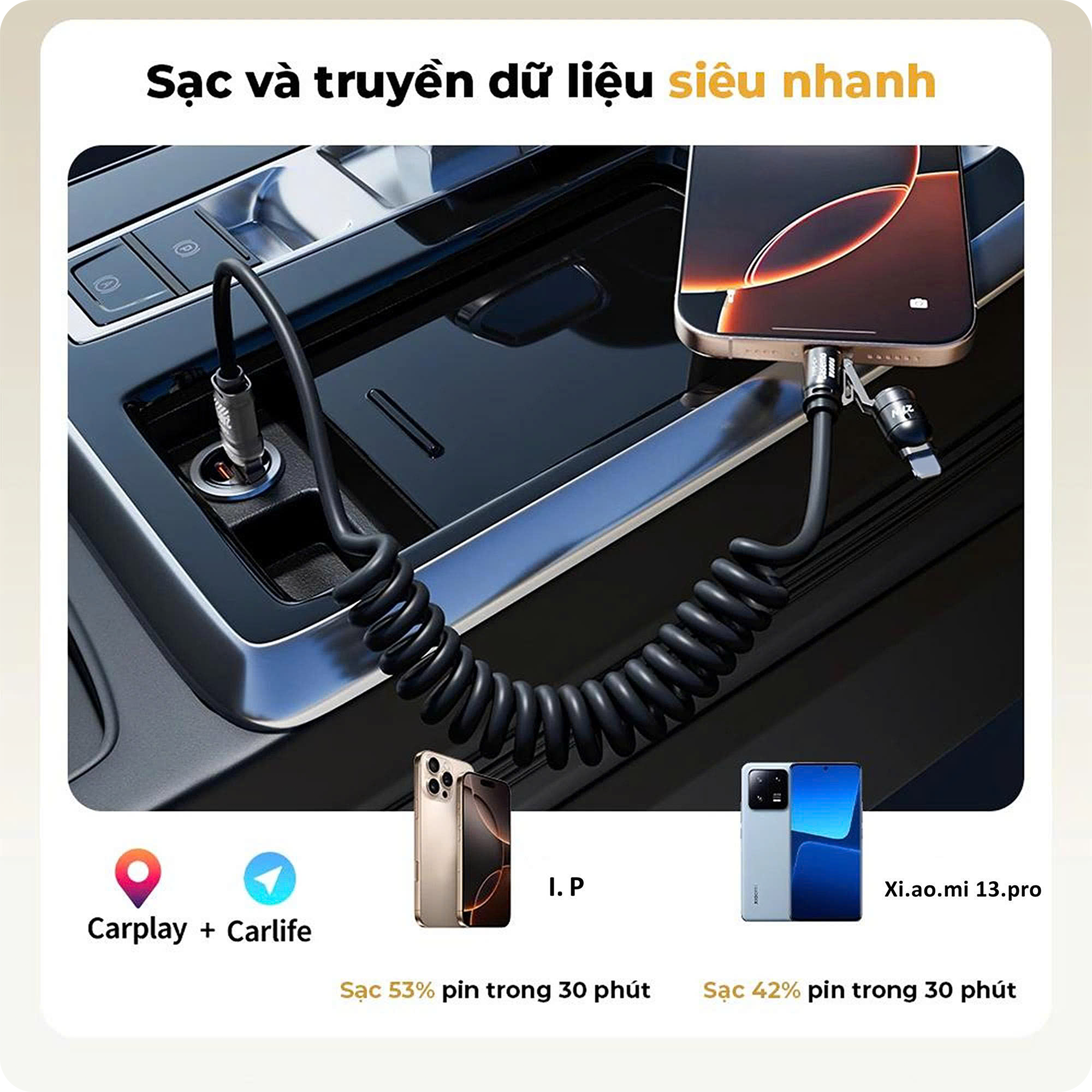 - Hỗ trợ CarPlay và CarLife: Cáp hỗ trợ kết nối CarPlay và CarLife, cho phép bạn dễ dàng sử dụng các tính năng giải trí và điều khiển xe hơi ngay trên điện thoại của mình. Độ dài 2m tối đa giúp người sử dụng ngồi phía sau vẫn sử dụng thuận tiện
